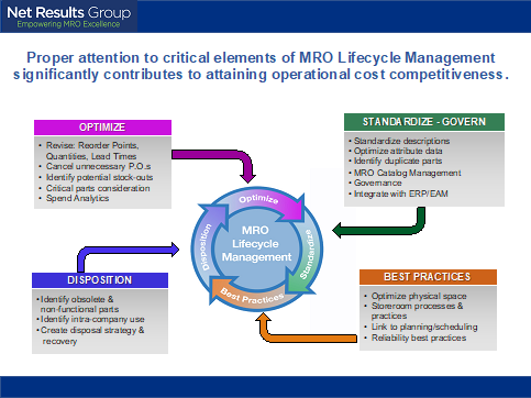 Not all aspects of our MRO Lifecycle Management techniques are needed for every client. It greatly depends upon their operational processes and understanding of the root causes impacting their ability to effectively tackle MRO matters. Most importantly, MRO Lifecycle Management involves a process that is required to move toward a more strategic approach to MRO within an organization.