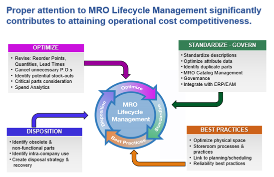 Best-practices MRO data management contributes significantly to operational cost competitiveness for your company. Yet, to reach this pinnacle, it is imperative that every strategic plan begins with having the right data processes to standardize and govern your MRO data. We call this “recipe for success” Intelligent MRO Life Cycle ManagementTM.